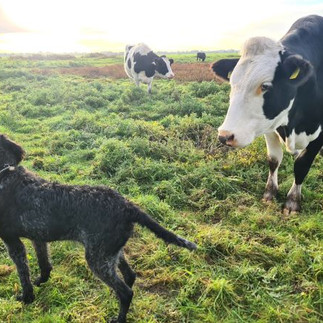 Zaterdagochtend mocht ik mee op de ganzen bij Vinkeveen. Op de weg naar de verzamelplaats, zat er nog een uil op de weg. Hij vloog op voordat ik kon zien welke het nu precies was. (Ik denk een ransuil.) Er vlogen echt veel ganzen, maar weer best ver bij ons vandaan. Gelukkig hebben we wel buit. In het weiland waar een andere jager en ik zaten, liepen jonge koeien. Die beesten zijn altijd erg nieuwsgierig, en kwamen ook nu even kijken wat wij daar toch aan het doen waren. Eentje was wel heel erg geĆÆnteresseerd in Soof. En hoewel Soof het best spannend vond, mocht de koe even aan haar ruiken.