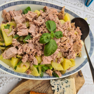 Kipkluifjes stonden deze week ook op het menu; Even insmeren met de marinade en de oven doet de rest. Ook een Chausson gemaakt. Bladerdeeg uitrollen, vullen met kaas, ham en een smeersel van crème fraîche en wat tijm. Dichtvouwen en ook hier doet de oven de rest van het werk. Een dipje van Roquefort en crème fraîche met wat rauwkost, en je hebt een verfrissend hartig hapje voor bij een drankje. Gisteren had ik naast de hapjes ook mijn Spaanse aardappelsalade met tonijn gemaakt. Die kun je ook zowel lauwwarm als koud eten. De aardappelen had ik in de ochtend al geschild en in stukjes gesneden en klaargezet om te koken. Voordat we aan tafel zouden gaan, heb ik de aardappeltjes gekookt, en die kleine stukjes zijn echt in no-time klaar. De dressing is in een minuutje gemaakt, en de overige groentjes en olijven zijn snel gesneden. Even door elkaar husselen en je hebt een complete maaltijdsalade.