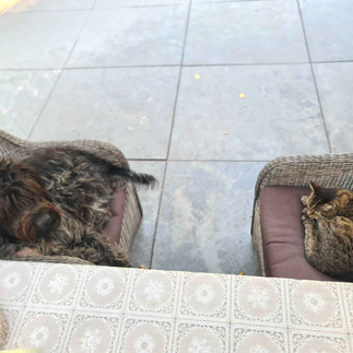 Niet dat dat de pret drukt, want deze jachtdagen zijn altijd ƩƩn groot feest. Als de jacht voorbij is, verzamelen wij bij de jachthouder. Daar zie ik mijn Drentse jachtvrienden ook weer. Eentje kon er helaas niet bij zijn. Jeroen was bij zijn zoon Thijs aan het kijken, die meedeed met een zelf in elkaar geknutselde brommer bij het Boerenrock Festival. Ook waren de Friese jachtvrienden van de partij en de Urker vrienden ontbraken natuurlijk ook niet. Zij zorgen ervoor dat er weer een Visfestijn is! Gerookte zalm op toast en kiloās versgebakken kibbeling gaan rond. Het is gezellig, het tableau is op de grasmat gelegd en terwijl de bak met gebakken vis en de plank met gerookte zalm steeds weer worden bijgevuld, kan iedereen weer even bijkletsen. Ik ga iets eerder weg, want ik ga nog naar vrienden Aad en Carlo die in de buurt wonen. Ook daar is het weer gezellig. Het is de laatste vakantieweek van Aad, hij zal binnenkort weer voor de klas staan. Aan het einde van de middag ga ik huiswaarts, met Fien in de kofferbak, die doodmoe is van alle nieuwe indrukken die zij weer heeft opgedaan.