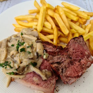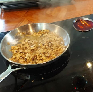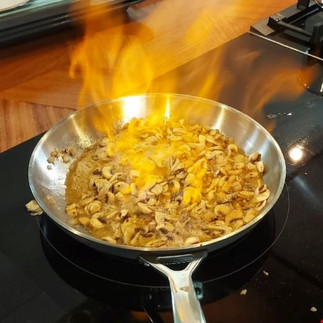 Sausje met champignons, cognac en bieslook bij. Deze saus is lekker bij rood vlees, maar kan ook prima bij een lekker stuk kip van de barbecue of uit de oven. Ik vind het altijd een schitterend gezicht als ik de cognac bij de champignons in de pan doe. Hup, de fik erin! Maar vooral niet vergeten de afzuigkap eerst uit te zetten! Fijne nazomerdag!!