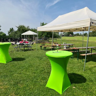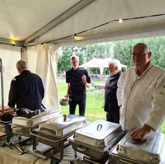 De tweede dag is de opstelling van meubilair zowel binnen in de grote tent als buiten verzet. Deze dag is het grote feest voor onze leden. Toen wij ¾ jaar geleden aan het brainstormen waren over wat nu een goed feest maakt, kwamen wij allen tot dezelfde conclusie: Leuke mensen, een drankje, een hapje en wat muziek erbij. Die leuke mensen hebben wij in onze WBE. Een frietkraam met patat en wildkroketten, een slager met verschillende lekkere belegde broodjes en sateetjes en als ‘toetje’ wafels met een keuze uit verschillende soorten zelfgemaakt ijs hebben wij als hapjes gekozen. Voor de muziek kwam een ontzettend leuk trio dat de muzikale ondersteuning gaf, Trioraak. Zij verplaatsten zich door de menigte en lieten gezellige deuntjes horen. Ze pasten hun muziek perfect aan bij ons publiek. Mede door het prachtige weer hebben wij beide feesten heerlijk buiten kunnen vieren. Ik kan niet anders zeggen dan dat ik van alle factoren die nodig zijn voor een goed feest met volle teugen heb genoten.