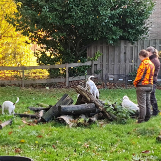 Hier krijgen we heerlijkheden die Jan eerder die week had gerookt en ik al de foto’s van het maakproces had mogen zien; Aan de lucht gedroogde Coppa van ree, ham van ree en van haas, een stukje gerookt zwijn en worst van zwijn en gerookte zalm. Alles is lekker, hoewel ik het meest geniet van de zwijnenworst. Die is zo mooi gekruid, het lijkt wel een Tiroolse worst, echt zalig. Terwijl de grote pan erwtensoep wordt opgewarmd, wordt de dag door alle deelnemers nog een keer doorgenomen. De drijvers hebben 17 kilometer gelopen vandaag en hebben het wel verdiend even te zitten en uit te rusten. Na de soep en een lekker toetje, drinken we nog even wat na en wordt er nog heel wat afgelachen. Dan is het tijd om naar huis te gaan, want het was een heerlijke en prachtige, maar ook een hele lange dag. Ik neem afscheid van iedereen en ga naar huis. Eenmaal thuis helpt manlief met alle spullen uit de auto te halen. Ik vertel bij een drankje over mijn dag met nieuwe belevenissen, waar ik ook weer veel geleerd heb, met ontzettend lieve en leuke mensen. Maar dan gaan bij mij de luiken dicht, stap ik nog even onder een heerlijk warme douche en duik mijn mandje met elektrische dekentje in🤗! Ik val als een blok is slaap. Vandaag heb ik mijn haas geslacht en panklaar gemaakt (dat wordt een lekkere Hazenpeper) en staat de pan met rillette van fazant (o.a. van vorige weekend) op het vuur te pruttelen. Dat wordt vast lekker en het volgende recept voor het blog. Het is immers jachtseizoen, en met alles wat wij jagers schieten, wordt een mooi gerecht gemaakt. En zo is mijn cirkel weer rond.