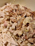 Neem een ruime pan en doe hier de fazant en patrijzen in. Het vlees moet onder het vocht liggen, snijd eventueel het gevogelte in stukken. Doe vervolgens de kippenbouillon erbij en vul dit aan door 2 x het potje te vullen met water en toe te voegen. Breng het geheel aan de kook. Als het kookt, temper je het vuur en schep je het schuim weg. Voeg dan de foelie en de laurierblaadjes toe. Laat dit, op zacht vuur met het deksel op de pan, ruim een uur pruttelen. Zet apart. Als het is afgekoeld (dat is prettiger voor je vingers met plukken), haal je het vlees uit de pan en verwijder je de botten. Pluk het vlees uit elkaar en zet apart. Haal de foelie en de laurierblaadjes uit de bouillon.