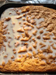 Neem een ruime ovenschaal (minstens 22-22 cm.). Vet deze in met wat boter of bakspray en bestuif deze met wat bloem. Stort hier het beslag in en bak de taart in ongeveer 40 minuten gaar en goudbruin. Laat helemaal afkoelen! Maak de zijkanten ‘los’ met een mes en prik met een sateprikker gaatjes in de gehele taart. (Dan neemt het de vloeistof straks beter op.)