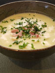 Voeg net voor het serveren de ham en de fijngesneden bieslook toe.