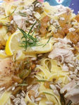 Neem een grote serveerschaal en doe hierin de pasta, verdeel de kip er overheen en vervolgens de saus, daarover de geroosterde pijnboompitten. Je zou er voor de garnering nog wat fijngehakte peterselie overheen kunnen doen.