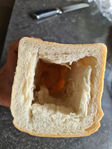 Neem het brood en haal het zachte binnenste eruit. Bewaar dat nog om wat ‘gaten’ op te vullen. Besmeer het brood aan de binnenkant met de mosterd met een lepel. Vul het brood eerst met portobello’s aan de bodem, dan de entrecote en daarna weer portobbello’s daar bovenop. Gaten kun je opvullen met het brood dat je had weggehaald, doop dat eerst nog even in het bakvet voor meer smaak en de gebakken steeltjes en randen.