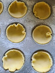 Steek de rondjes uit het bladerdeeg en bekleed de vormpjes hiermee. Je redt het niet helemaal met het bladerdeeg en de rondjes steken, dus van wat 'over' is van het bladerdeeg met de deegroller even rollen en daar de resterende rondjes uit steken. Prik met een vork een paar gaatjes. Schep het kaasmengsel in de vormpjes en bak de taartjes in ongeveer 20-25 minuutjes gaar.